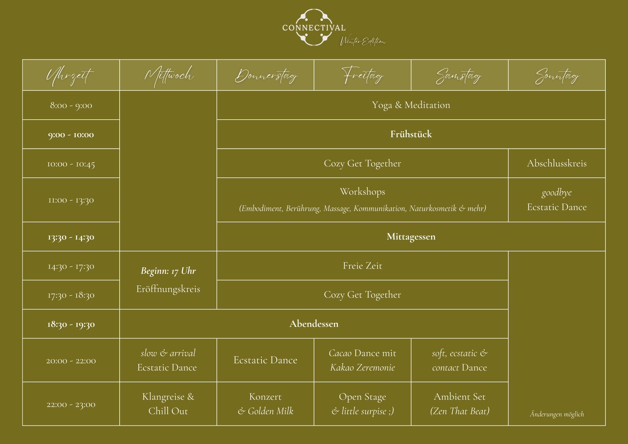 TErMINE2026 WINTER CONNECTIVAL 25. Februar - 1. März 2026 NATURE COMMUNITY | Bayern SOMMER CONNECTIVAL 3. - 7. Juni 2026 Oberthal | Saarland tickets coming soon...SOMMER RETREAT 8. - 13. Juni 2026 Oberthal | Saarland tickets coming soon...   HERBST RETREAT 3. -...